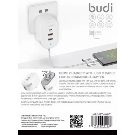 Budi Home Charger With USB-C Cable / Lightning & Micro Adapter – White