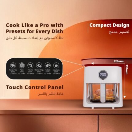 8 presets for convenient cooking without the hassle of manual adjustments, Food-grade glass pot and non-stick tray for healthy and easy-to-clean cooking, 1200W power, 60-minute timer and adjustable temperature up to 200°C, 360° panoramic view for easy and quick food monitoring
