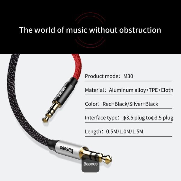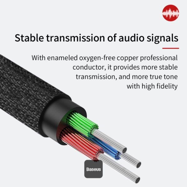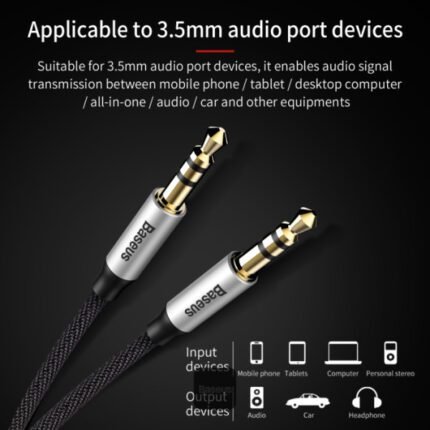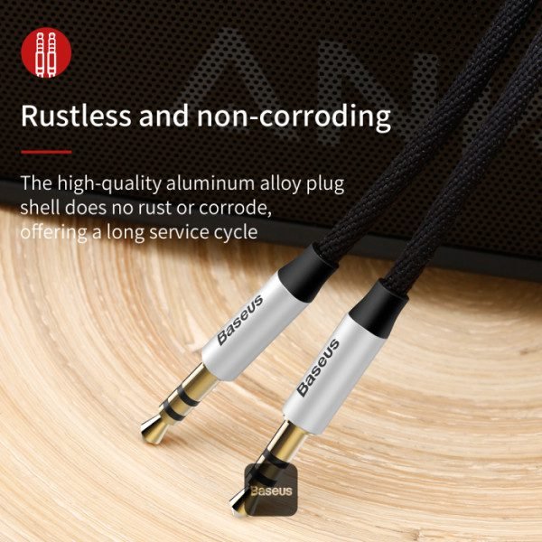 The Baseus Yiven Audio Cable is designed to connect devices with a 3.5mm mini jack port to speakers, headphones, and other audio devices. Crafted from high-quality materials like aluminum, TPE, and braided textile, this cable ensures durability and resistance to wear. The gold-plated ends provide stable sound transmission without any interference.