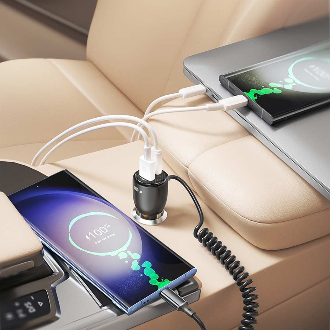 Learn about the Porodo 110W Dual Port Transparent Aluminum Car Charger, which expertly blends power and style. Its 45W output and integrated 1M Type-C cable ensure worldwide compatibility, and it is designed for simultaneous charging. It also offers a USB-A QC at 45W and a powerful USB-C PD at 65W. PPS range: 3.6-11V/5A; total output: 110W; precision-engineered from PC and aluminum alloy. Drive forward with the highest level of charging efficiency available.