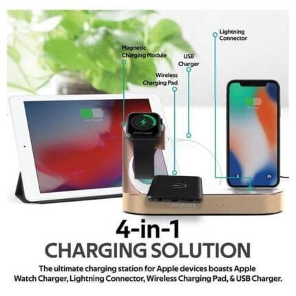Charge and display your Apple Watch and iPhone simultaneously with this 4-in-1 PowerState Charging Dock for Apple devices. With a Magnetic Charging Module for the Apple Watch built into the dock, your Apple Watch aligns magnetically and begins charging instantly. PowerState features a wireless charger that can charge any wireless charging enabled device, and an Apple MFi certified built-in lightning connector to charge your iPhone, that can be adjusted to fit almost any case. Engineered to charge all connected devices at the fastest possible speed, the dock also elevates them for safety and visibility while they charge.