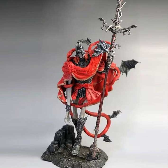 Step into the dark and mysterious world of Elden Ring with this stunning 46 cm resin figurine. Featuring a skeletal warrior adorned in detailed red armor and a flowing cape, this collectible captures the essence of gothic artistry. The warrior wields a tall, intricately designed staff, complemented by bat-like wings emerging from its back, all standing on a rocky base. Perfect for fans of the game and collectors of dark fantasy art, this figurine is crafted with high-quality resin to ensure durability and a premium finish. A must-have centerpiece for any Elden Ring enthusiast’s collection.