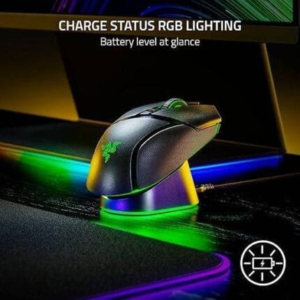 - Charge Status RGB Lighting: The mouse and dock will light up to reflect battery level—from low (red) to mid (yellow) to full (green)