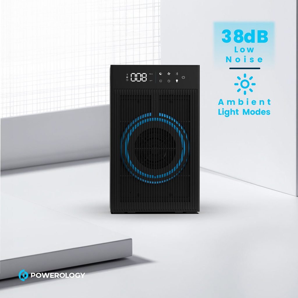 Transform your indoor environment with the Powerology Smart Air Purifier, an engineered air purifier that efficiently promotes cleaner and healthier indoor living. The smart 3-stage air purifier will help you remove all kinds of pollutants and allergens and will promote indoor air quality throughout the house. The PM2.5 sensor ensures real-time air quality checks with automatic adjustment. Ambient light modes create a soothing atmosphere, adding a touch of ambiance to any room you occupy. Offering a coverage area of 14m² to 24m² and particulate CADR of 200m³/h, this is ideal for many kinds of spaces. The essential oil diffuser allows you to fill your space with your favorite scents to promote relaxation and really feel at home. It’s also silent, working at just 38db, helping retain peace in your environment. It comes with a low-rated power of 48W, so it’s energy efficient. Convenience-driven, the Powerology Smart Air Purifier has a UK 3-pin plug with wireless charging of 10W, making it stylish and functional in any home. Breathe deeply into truly clean room air with the Powerology Smart Air Purifier, which features an H11 HEPA filter for better capabilities.