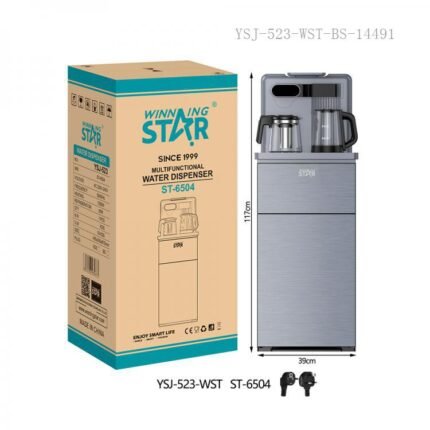 Winning Star Smart Tea Machine And Water Dispenser with Built-in Electric Kettle Cooler, a versatile electric appliance designed to provide hot and cold water easily and efficiently, making it suitable for homes, hotels, and commercial spaces. The product features top loading for easy use, with a heating capacity of 1350W and cooling capacity of 65W. It includes a stainless steel cold water tank and a rear condenser for enhanced performance, making it an ideal choice for water anytime.
