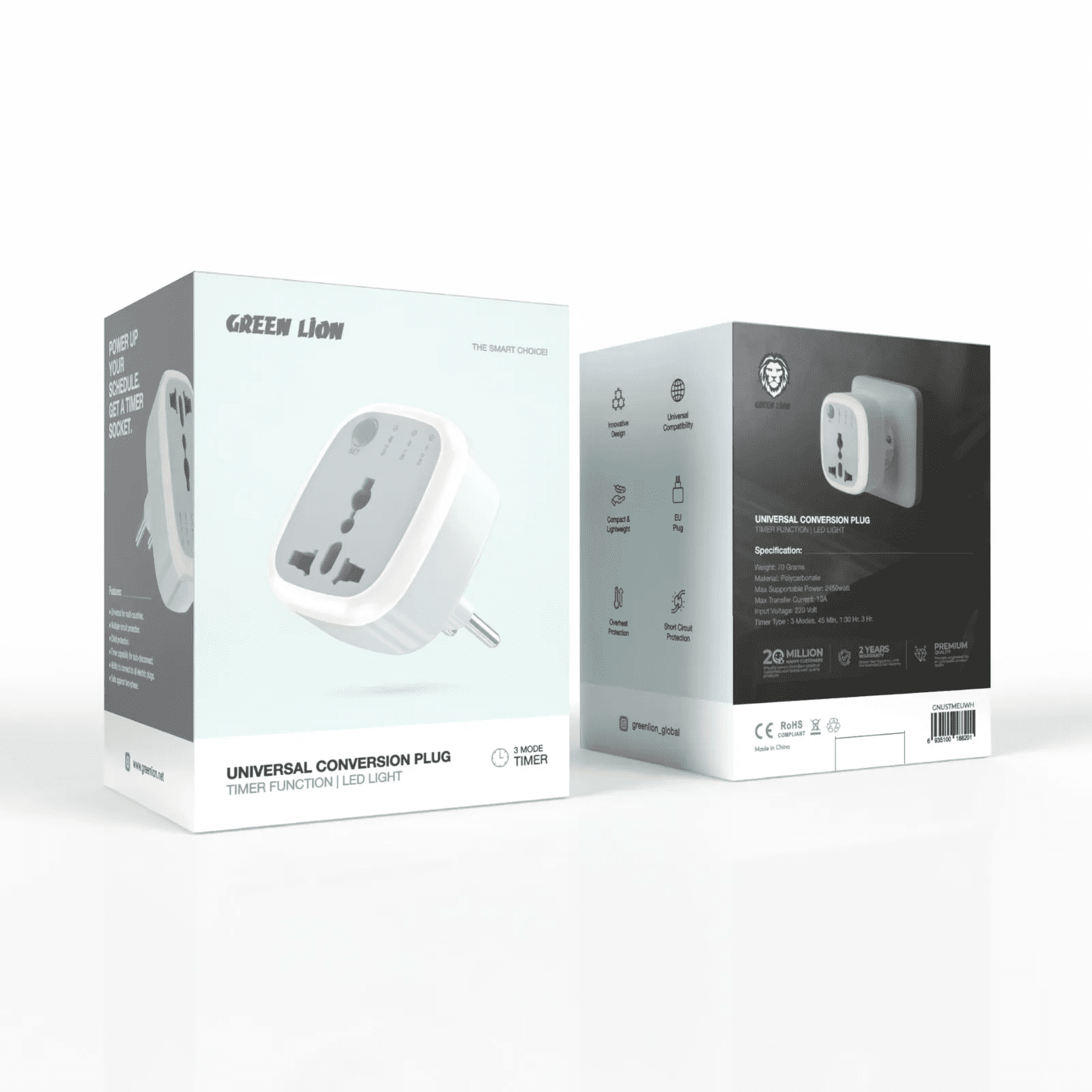 The Green Lion Universal Conversion Plug, includes a timer function and LED light, is a multipurpose accessory designed to streamline daily habits and enhance safety. Made from durable polycarbonate, this compact plug is both lightweight and strong, making it ideal for travel or everyday usages. It supports a maximum power of 2450 watts and can handle up to 10 amps of current, ensuring compatibility with a wide range of electronics. Operating at 220V, the device features three preprogrammed timer mode in 45 minutes, 1.5 hours, and 3 hours, which allow you to automatically shut down connected devices, that also helps conserve energy and prevent overuse. Engineered to work with various international sockets, this universal plug provides functionality across different countries. The Green Lion Universal Conversion Plug is a dependable alternative for safely powering your devices, as it can connect to most electric plugs and includes several safety features.