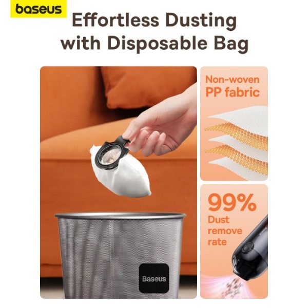 Baseus AP01 Wireless Handy Vacuum Cleaner with Disposable Dust Bags for Home & Car | Rechargeable, 5000 Pa – Black