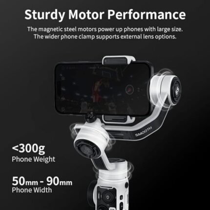 The white SMOOTH 5S Combo Smartphone Stabilizer Combo from Zhiyun-Tech combines the smartphone gimbal with a magnetic fill light, a 1-year Zhiyun Prime membership, a carrying bag, and a wrist strap. the SMOOTH 5S has been updated with a powerful integrated fill light, upgraded motors, a new algorithm, and a wider clamp. With support for larger smartphones weighing 5.3 to 10.6 oz and measuring 0.4″ thick and 2 to 3.5″ wide, the SMOOTH 5S will even support select external lens/smartphone combinations. A wider space between each of the three axes enables you to create more extreme, cinematic angles. Designed for one-person capture, this gimbal stabilizer also offers intuitive panel control, quick-switch modes, a robust runtime of up to 25 hours, and fast PD charging of only two hours. Compatibility with three mobile apps geared towards users of various levels enables you to livestream, control focus, and create time-lapse, cloning, dolly/zoom, and slow-motion effects.