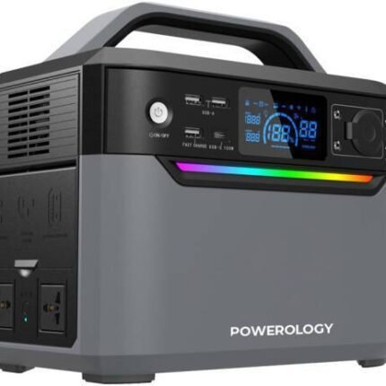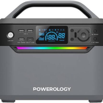 The Powerology power generator is a super helpful device that lets you keep all your electronic gadgets charged up, perfect for outdoor trips or when you need backup power. It’s packed with a huge 120000mAh and 384W battery, big enough to charge your phone up to 32 times! You can plug it into your car with its 100W car charger outlet for easy charging on the move. Plus, it can be powered up by sunlight thanks to two solar charging inputs, each taking in 100W, which is good for the environment. It gives out 600W of power (with a peak of 650W) to run bigger devices, and also has a 15W wireless pad for cable-free phone charging, along with a 100W PD port for fast charging your bigger gadgets like laptops. It even comes with a flashlight for when you need light and an LED indicator to show you how much power is left, making it a super versatile and user-friendly power source for all your needs.