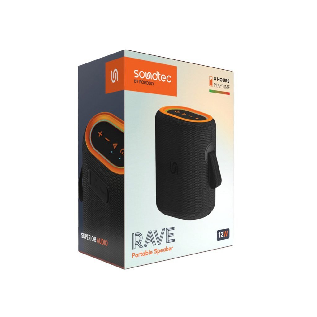The Porodo Soundtec Rave Portable Speaker in Black is designed to change your audio experience wherever you go. With its powerful 2000mAh battery, this speaker provides up to 8 hours of playtime at 50% volume, ensuring your music keeps playing during adventures. The quick 2-hour recharge time gets you back in action swiftly. Equipped with a 66mm driver unit, it delivers a crisp, clear sound with a maximum output power of 12W, perfect for enjoying deep bass and detailed highs. The speaker also features Bluetooth V5.3 for seamless wireless connectivity and a Micro SD slot that supports up to 32GB, allowing for versatile playback options. Compact and lightweight, this speaker combines convenience, style, and performance in one modern package.