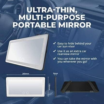 - Universal Size Design: The size of this car vanity makeup mirror is 10.2(L)*5.3(W)*0.4(H) inch, suitable for most of the sun visors of cars. This car vanity mirror is compact, lightweight, and saves more space inside the car. The adjustable velcro ensures the mirror is mounted safely.