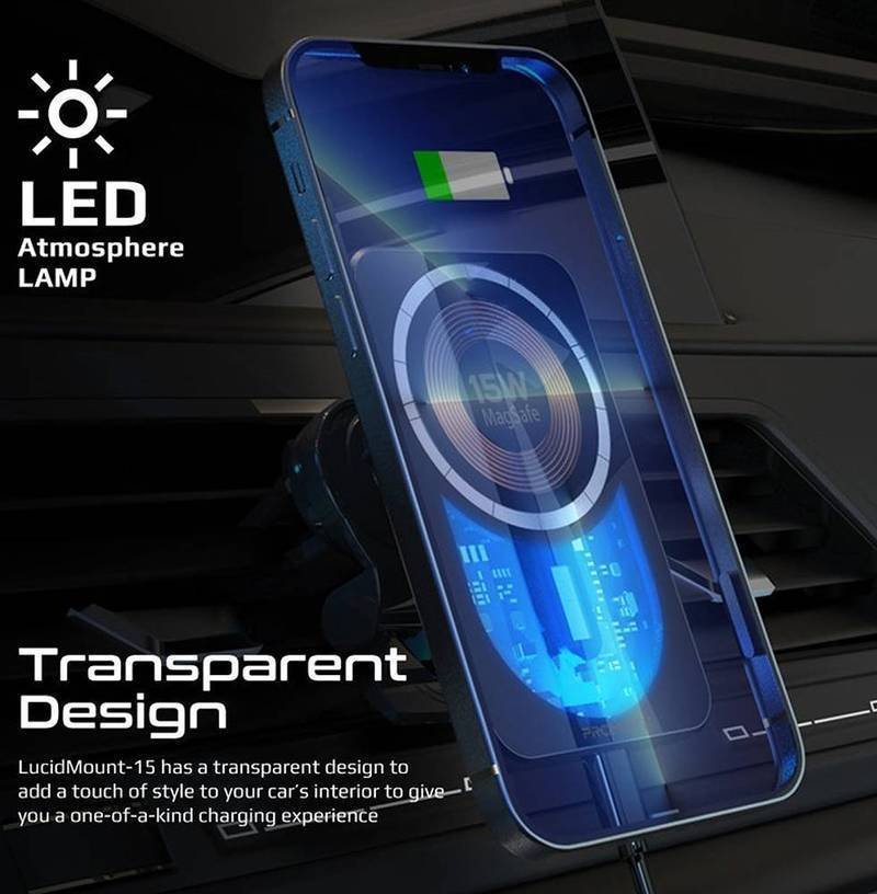 LucidMount-15 is a stunning wireless car mount and the perfect charging solution, engineered to enhance your driving experience. This elegant car mount with a unique transparent design, aluminum rim, and MagSafe technology makes it the perfect accessory for your car. Smoothen your journey, as the strong magnets on LucidMount-15 allow you to snap on devices quickly and keep them steady through the roughest terrain. The cradleless design lets you view attached devices at any angle. Enjoy reliable, high-speed charging and hands-free access with LucidMount-15.