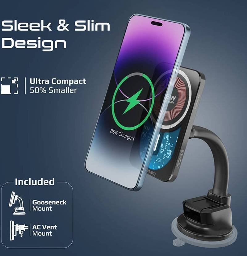 Promate LucidMount 15W MagSafe Transparent Car Wireless Charger, Alloy Crafted Material, 360