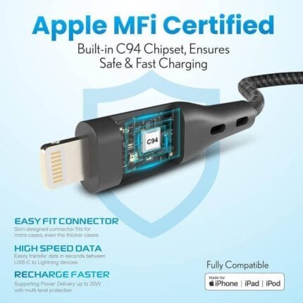 - Apple MFi Certified C to Lightning Cable: 1.2m Type-C to Lightning Cable with the original Apple MFi Chip, Built with Apple’s latest C94 Chipset, ensure safe and fast charging. MFi Certified licensed iPhone charging cable promises no warning message pops up. In addition, the MFi Certified Cable comes with surge protection and other advanced safety features to keep your iPhone/iPad/Airpods devices safe.